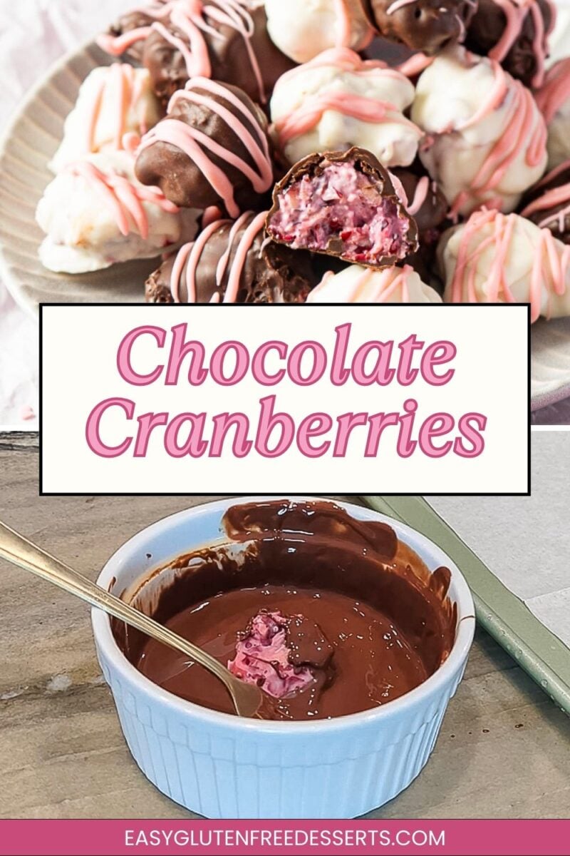 - Drop cranberries into the melted chocolate and stir to coat. Use a fork to lift each cranberry, letting excess chocolate drip back into the bowl. Place bake on the baking sheet. Drizzle with additional chocolate if desired.8 ounces semi-sweet chocolate chips, 1 teaspoon coconut oil