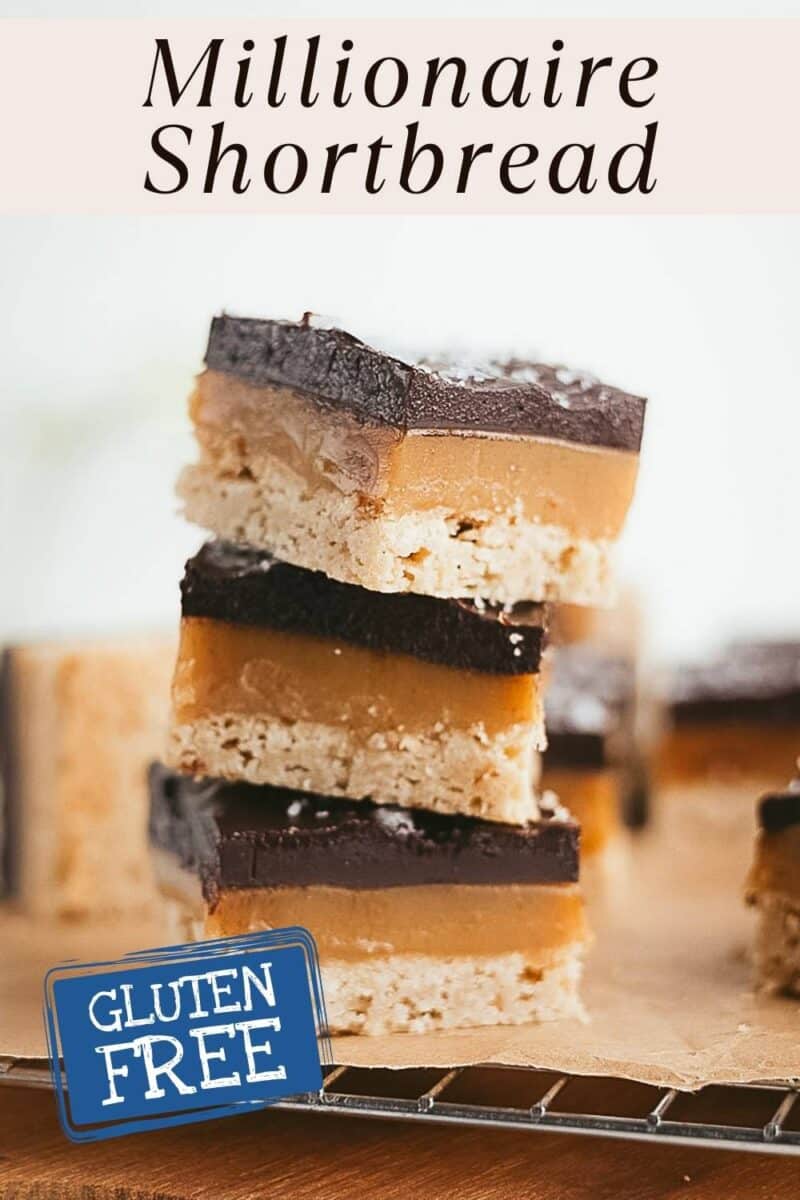 This Gluten Free Millionaire's Shortbread is a triple-layer dessert bar. Rich in name and in flavor. This recipe is made of three easy to make layers. A buttery shortbread crust, chewy salted caramel, and glossy chocolate ganache stack up into one seriously satisfying treat.