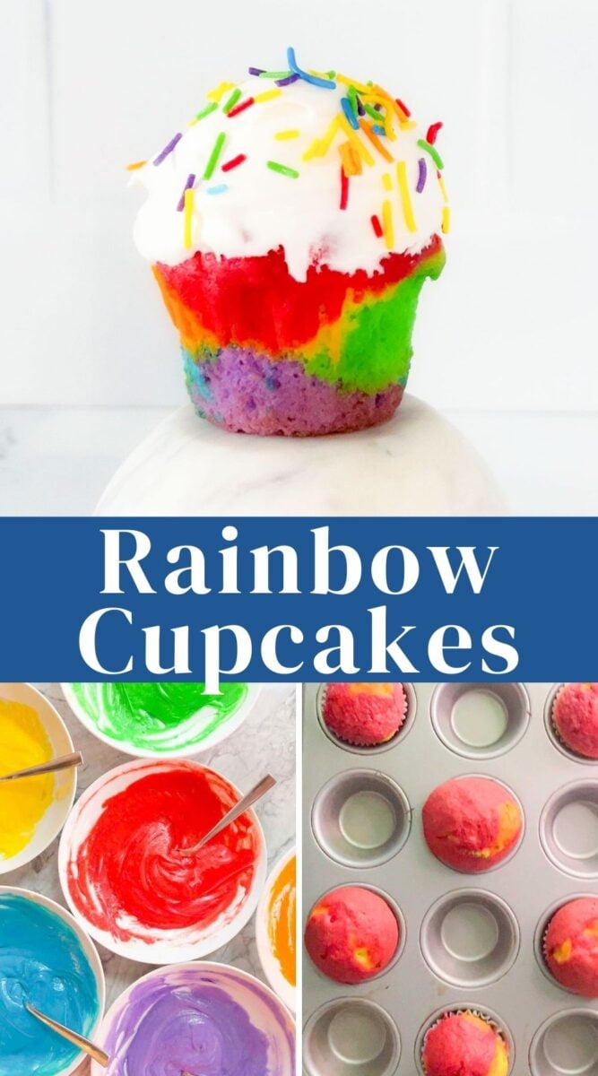 A step-by-step visual guide for making rainbow cupcakes. You can skip to the recipe for the full written instructions.